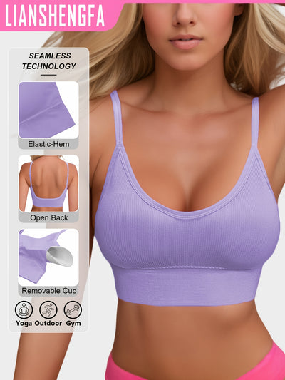LIANSHENGFA Women's Classic Ribbed Yoga Tank Top - Backless Design with Removable Cups, High Support Seamless Workout Bra, High Elasticity for Gym & Outdoor Activities, Solid Color, Sporty Ribbed Texture, Easy Maintenance Clo
